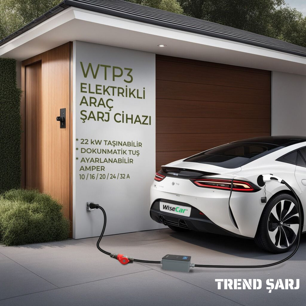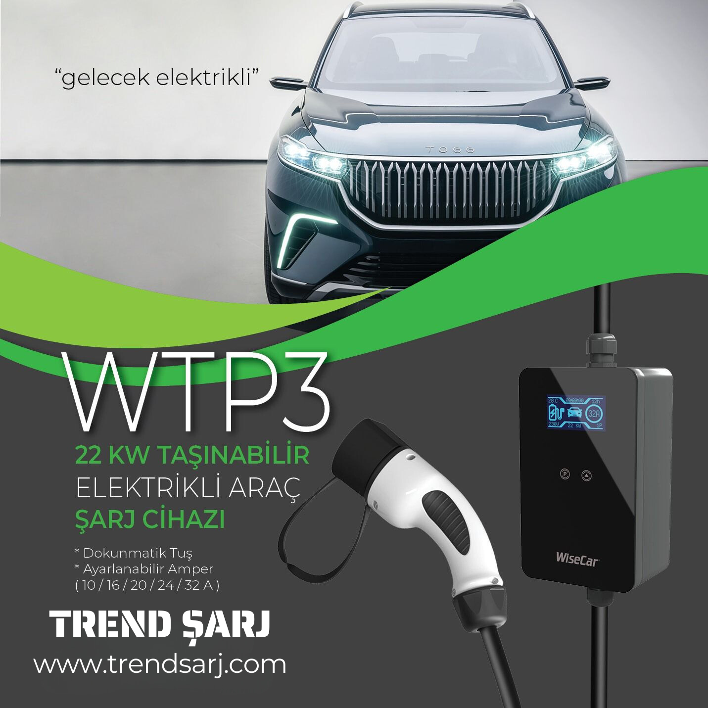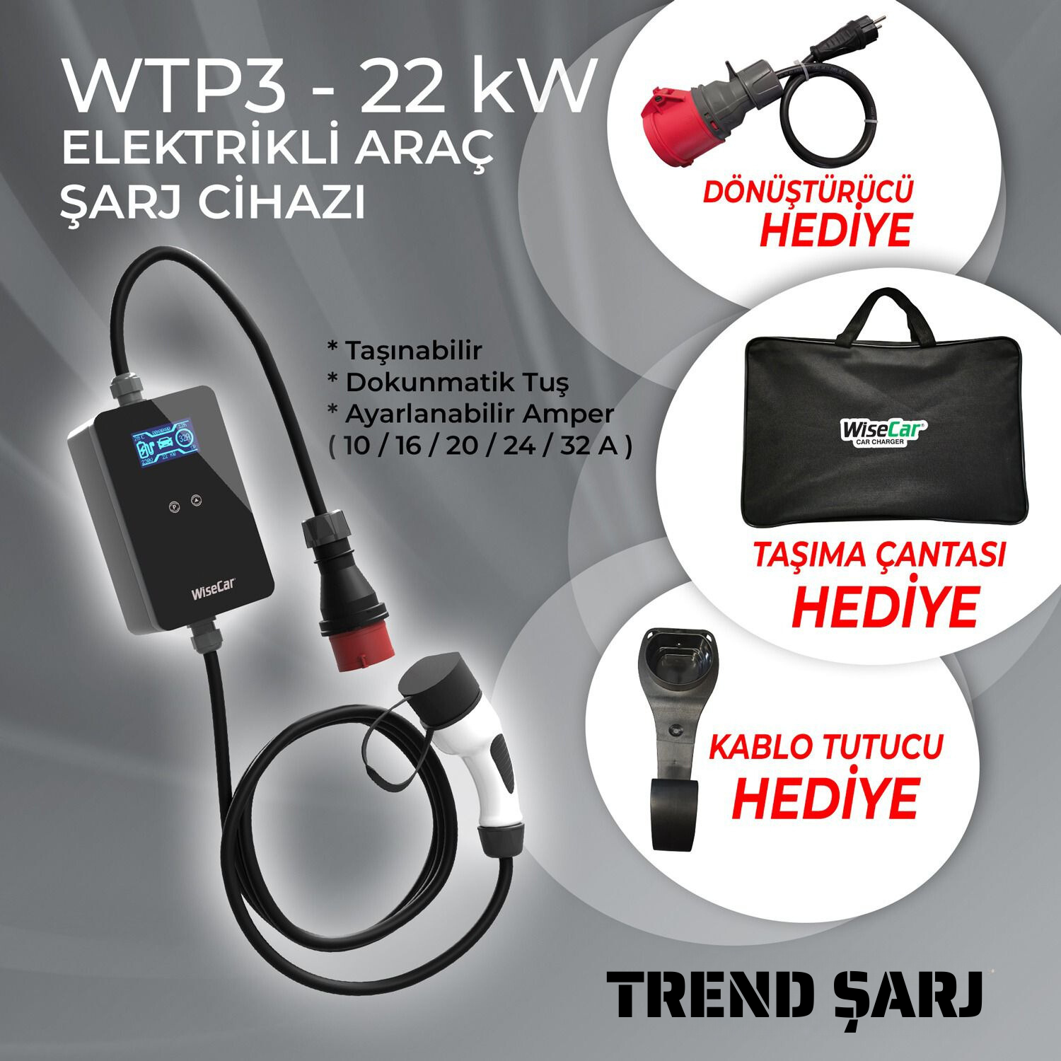 WiseCar WTP3 22 KW Taşınabilir Elektrikli Araç Şarj Cihazı WiseCar WTP3, mobil uygulama destekli, yüksek performanslı ve taşınabilir elektrikli araç şarj cihazıdır. Gelişmiş bağlantı özellikleri ve kullanıcı dostu tasarımıyla, her yerde ve her zaman hızlı ve güvenilir bir şarj deneyimi sunar. Özellikler: • Ayarlanabilir Güç (3.5 - 7.4 - 11 - 22 KW): İhtiyacınıza göre güç seviyesini ayarlayarak optimal şarj performansı. • Saat Ayarı: Şarj süresini önceden belirleyerek enerji tasarrufu sağlayın. • Taşıma Çantası: Taşınabilirlik için özel olarak tasarlanmış, dayanıklı ve şık taşıma çantası. • 220V Priz Dönüştürücü: Her türlü prizde kullanım için dönüştürücü hediyeli. • Dokunmatik Ekran: Kullanımı kolay, modern dokunmatik ekran. • Su Geçirmez (IP67 Sertifikalı): Zorlu hava koşullarında bile güvenle kullanılabilir. • CE Belgeli: Avrupa standartlarına uygun güvenilir yapı. • 5M Kablo Dahil: Uzun kablosu ile esnek ve rahat kullanım. Uyumluluk ve Destek: • Tüm Elektrikli Araçlar İçin Uygundur: Her marka ve model elektrikli araç ile uyumlu. • WiseCar Servis ve Garanti: çağrı merkezi hizmeti ve 2 yıl garanti ile her an yanınızdayız. • Çağrı Merkezi Numarası: +90 534 837 01 11 Kutu İçerikleri: • WiseCar WTP3 Şarj Cihazı (5 Metre Kablolu) • Taşıma Çantası •Duvar Asma Aparatları • 220V Priz Dönüştürücü • Kullanım ve Kurulum Kitapçığı • Garanti Belgesi WiseCar WTP3 ile şarj deneyiminizi bir üst seviyeye taşıyın. Hemen sipariş verin ve her zaman ve her yerde konforlu sürüşün tadını çıkarın!