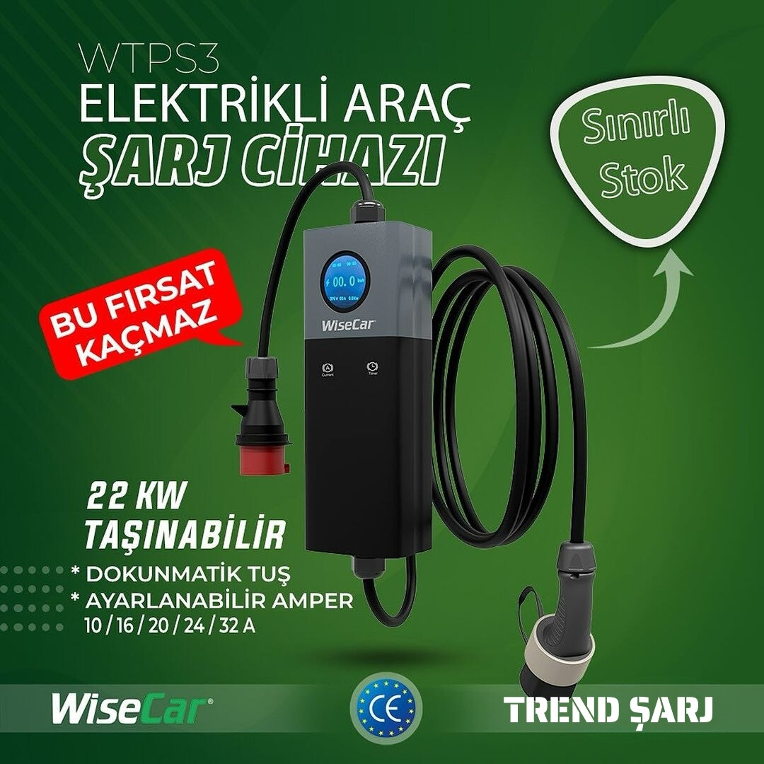 WiseCar WTPS3 22 KW Taşınabilir Elektrikli Araç Şarj Cihazı Mobil Uygulamalı + Wifi + Bluetooth -Mobil Uygulama İle Kontrol -Wifi + Bluetooth -3.5 - 7.4 - 11 - 22 Ayarlanabilir KW -Saat Ayarı -Taşıma Çanta Hediyeli -220 Priz Dönüştürücü Hediyeli -Dokunmatik -Su Geçirmez IP67 SERTİFİKA -CE BELGESİ 5M Kablo Dahil Fiyatıdır Tüm elektrikli araçlar için uygundur. WiseCar servis ve garantisi ile Çağrı merkezi hizmeti verilmektedir. Garanti: 2 Yıl